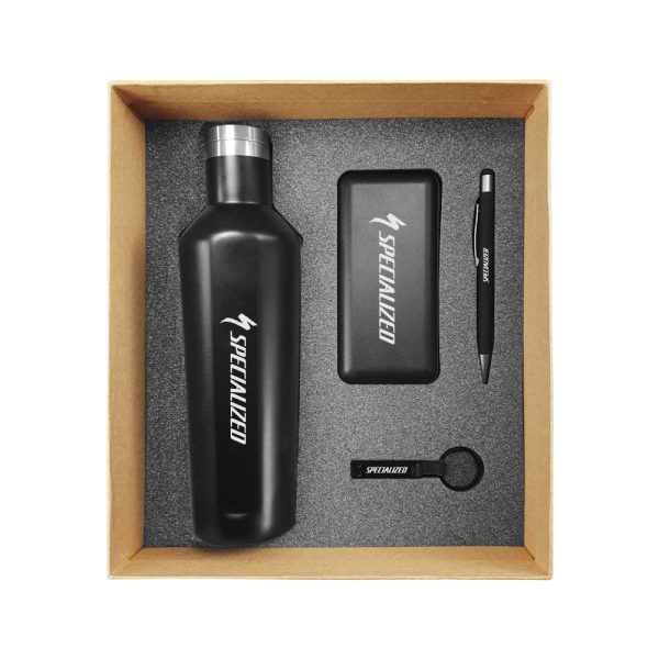 1. TM-015-BK: Black Stainless Steel Bottle | 2. PB-8000-BK: Black Powerbank with built-in Cables 8000 mAh | 3. USB-68: Black Metal USB Flash Drives with Keyring – 8GB | 4. PN42-BK: Black Rubberized Metal Pen with Stylus.