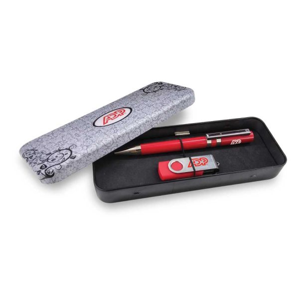 The box used for packaging is constructed of thin metal. It is unique because it can hold multiple pens. The container box is suitable for use as a gift set. It is a great gift package because it includes a USB, a pen, a key holder, etc. In addition, the gift set features a space for a logo that can be printed on the top of the lid.