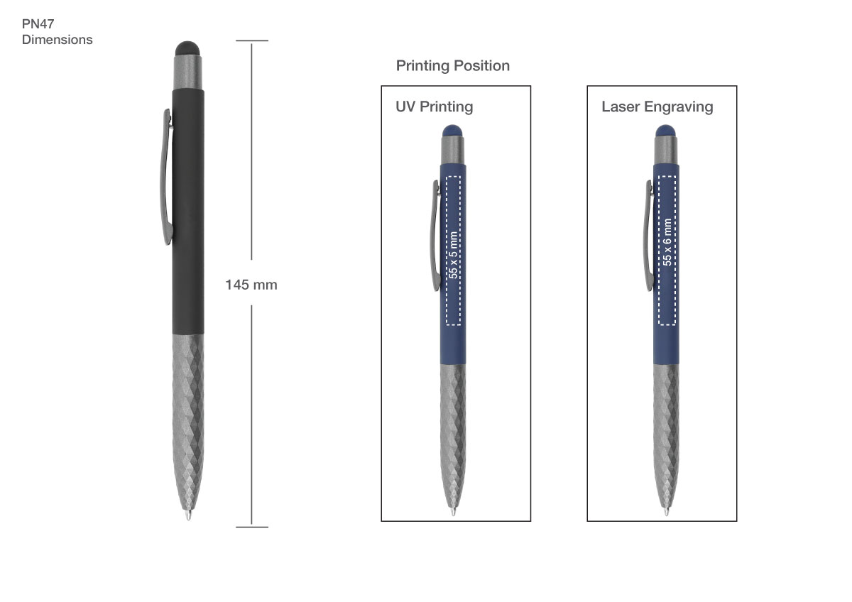 Stylus metal pens with Texture Grip are versatile writing instruments that combine the functionality of a traditional pen with the touch-screen capabilities of a stylus. These metal pens are often used with mobile, tablets, and other touchscreen devices, allowing users to write, draw, and interact with their devices more precisely than with their fingers.